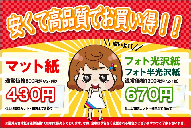 値段は激安価格ですが、サービス・品質には絶対の自信を持って営業しておりますので、DTPデザイナーの方、コミケ参加の方、店舗経営の方、ライブハウスで活動される方など、どんな方でもお気軽にご利用下さい。